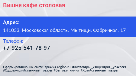 Вишня, кафе-столовая по адресу 141033, Московская область, Мытищи, Фабричная, 17 в дальнейшем Организация, размещена в следующих категориях: