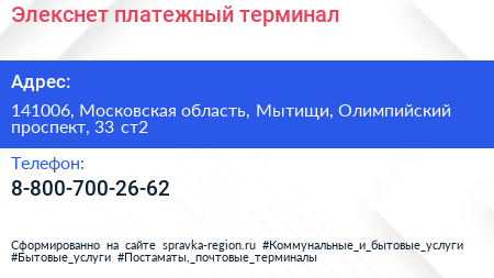 Элекснет, платежный терминал по адресу 141006, Московская область, Мытищи, Олимпийский проспект, 33 ст2 в дальнейшем Организация, размещена в следующих категориях: