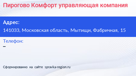 Пирогово-Комфорт, управляющая компания по адресу 141033, Московская область, Мытищи, Фабричная, 15 в дальнейшем Организация, размещена в следующих категориях: