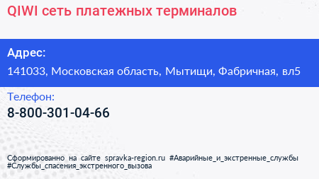 QIWI, сеть платежных терминалов по адресу 141033, Московская область, Мытищи, Фабричная, вл5 в дальнейшем Организация, размещена в следующих категориях: