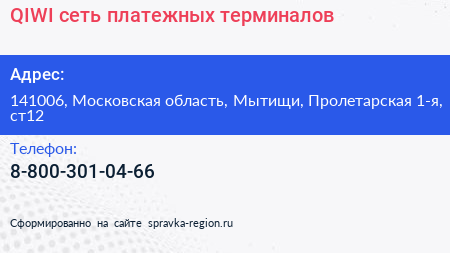 QIWI, сеть платежных терминалов по адресу 141006, Московская область, Мытищи, Пролетарская 1-я, ст12 в дальнейшем Организация, размещена в следующих категориях: