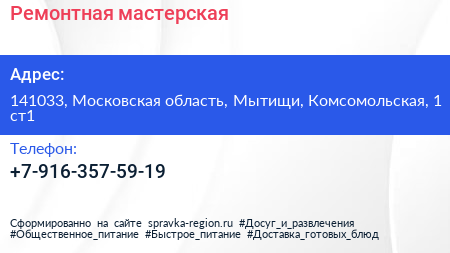 Ремонтная мастерская по адресу 141033, Московская область, Мытищи, Комсомольская, 1 ст1 в дальнейшем Организация, размещена в следующих категориях: