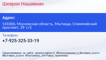 Шеврон Нашивкин по адресу 141006, Московская область, Мытищи, Олимпийский проспект, 29 ст1 в дальнейшем Организация, размещена в следующих категориях: