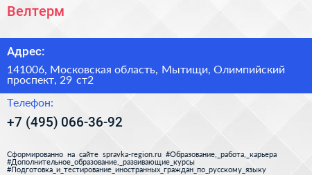 Велтерм по адресу 141006, Московская область, Мытищи, Олимпийский проспект, 29 ст2 в дальнейшем Организация, размещена в следующих категориях: