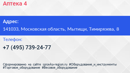 Аптека №4 по адресу 141033, Московская область, Мытищи, Тимирязева, 8 в дальнейшем Организация, размещена в следующих категориях:
