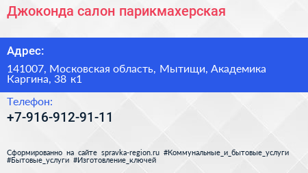 Джоконда, салон-парикмахерская по адресу 141007, Московская область, Мытищи, Академика Каргина, 38 к1 в дальнейшем Организация, размещена в следующих категориях: