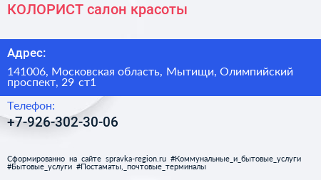 КОЛОРИСТ, салон красоты по адресу 141006, Московская область, Мытищи, Олимпийский проспект, 29 ст1 в дальнейшем Организация, размещена в следующих категориях: