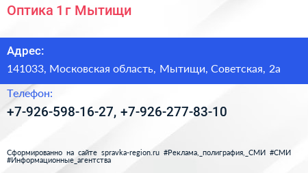 Оптика №1, г. Мытищи по адресу 141033, Московская область, Мытищи, Советская, 2а в дальнейшем Организация, размещена в следующих категориях: