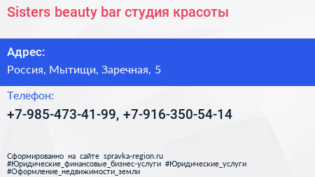 Sisters beauty bar, студия красоты по адресу 5, Заречная улица, Жилой комплекс «Афродита», посёлок Мебельной Фабрики, Пирогово, городской округ Мытищи, Московская область, Центральный федеральный округ, 141033, Россия в дальнейшем Организация, размещена в следующих категориях: