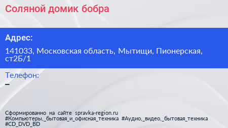 Соляной домик бобра по адресу 141033, Московская область, Мытищи, Пионерская, ст2Б/1 в дальнейшем Организация, размещена в следующих категориях: