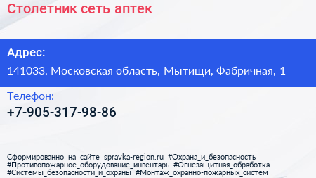 Столетник, сеть аптек по адресу 141033, Московская область, Мытищи, Фабричная, 1 в дальнейшем Организация, размещена в следующих категориях: