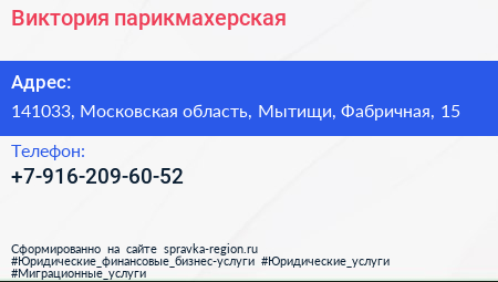 Виктория, парикмахерская по адресу 141033, Московская область, Мытищи, Фабричная, 15 в дальнейшем Организация, размещена в следующих категориях: