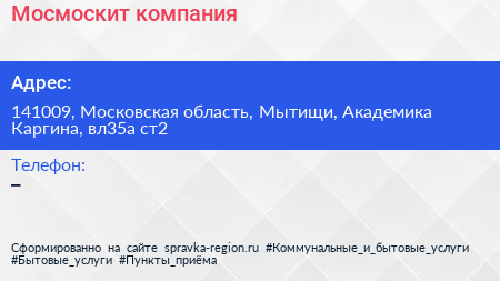 Мосмоскит, компания по адресу 141009, Московская область, Мытищи, Академика Каргина, вл35а ст2 в дальнейшем Организация, размещена в следующих категориях: