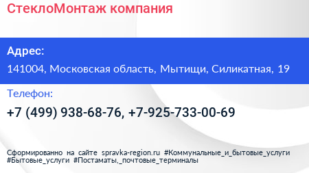 СтеклоМонтаж, компания по адресу 141004, Московская область, Мытищи, Силикатная, 19 в дальнейшем Организация, размещена в следующих категориях: