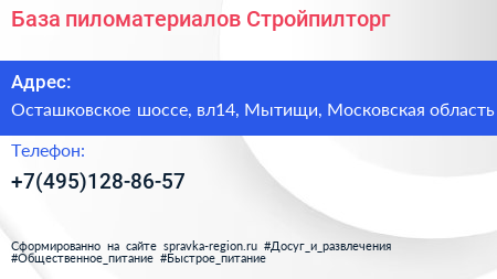 База пиломатериалов «Стройпилторг» по адресу Осташковское шоссе, вл14, Мытищи, Московская область в дальнейшем Организация, размещена в следующих категориях: