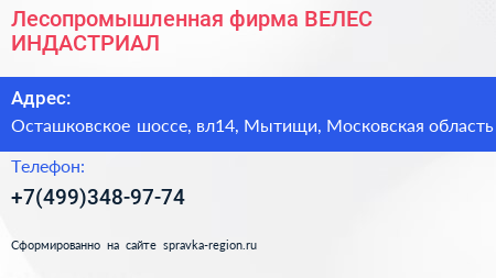 Лесопромышленная фирма «ВЕЛЕС ИНДАСТРИАЛ» по адресу Осташковское шоссе, вл14, Мытищи, Московская область в дальнейшем Организация, размещена в следующих категориях: