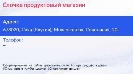 Ёлочка, продуктовый магазин по адресу 678020, Саха (Якутия), Мохсоголлох, Соколиная, 20г в дальнейшем Организация, размещена в следующих категориях: