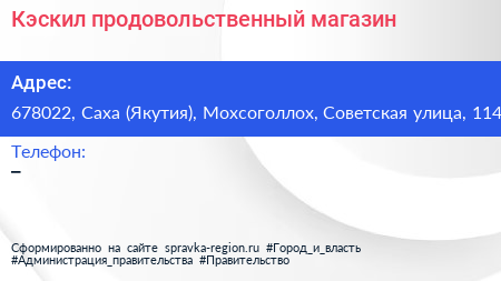 Кэскил, продовольственный магазин по адресу 678022, Саха (Якутия), Мохсоголлох, Советская улица, 114 в дальнейшем Организация, размещена в следующих категориях: