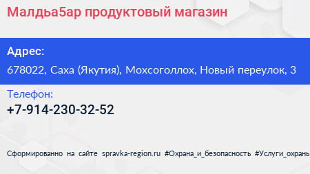 Малдьа5ар, продуктовый магазин по адресу 678022, Саха (Якутия), Мохсоголлох, Новый переулок, 3 в дальнейшем Организация, размещена в следующих категориях: