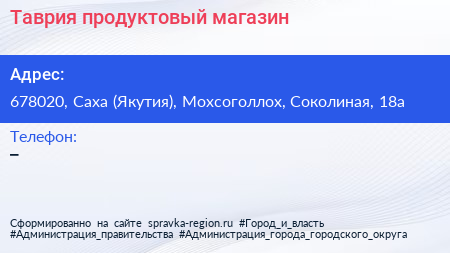Таврия, продуктовый магазин по адресу 678020, Саха (Якутия), Мохсоголлох, Соколиная, 18а в дальнейшем Организация, размещена в следующих категориях: