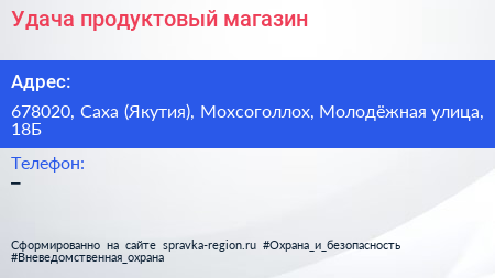 Удача, продуктовый магазин по адресу 678020, Саха (Якутия), Мохсоголлох, Молодёжная улица, 18Б в дальнейшем Организация, размещена в следующих категориях: