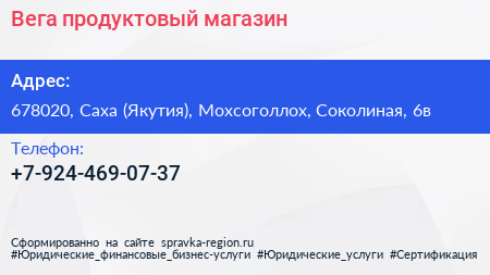 Вега, продуктовый магазин по адресу 678020, Саха (Якутия), Мохсоголлох, Соколиная, 6в в дальнейшем Организация, размещена в следующих категориях: