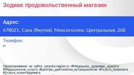 Зодиак, продовольственный магазин по адресу 678021, Саха (Якутия), Мохсоголлох, Центральная, 26Б в дальнейшем Организация, размещена в следующих категориях: