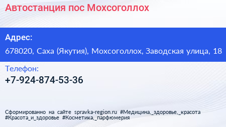 Автостанция, пoc. Мохсоголлох по адресу 678020, Саха (Якутия), Мохсоголлох, Заводская улица, 18 в дальнейшем Организация, размещена в следующих категориях: