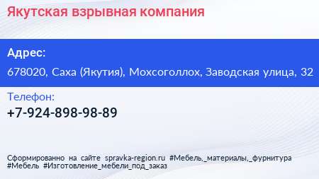 Якутская взрывная компания по адресу 678020, Саха (Якутия), Мохсоголлох, Заводская улица, 32 в дальнейшем Организация, размещена в следующих категориях: