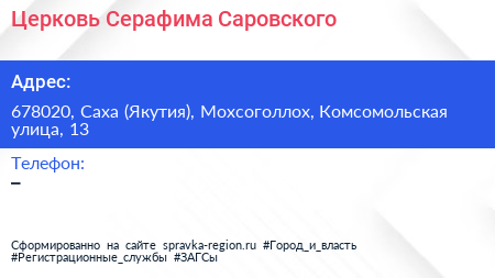 Церковь Серафима Саровского по адресу 678020, Саха (Якутия), Мохсоголлох, Комсомольская улица, 13 в дальнейшем Организация, размещена в следующих категориях: