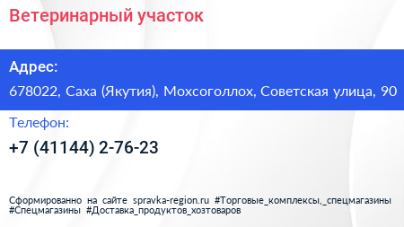 Ветеринарный участок по адресу 678022, Саха (Якутия), Мохсоголлох, Советская улица, 90 в дальнейшем Организация, размещена в следующих категориях:
