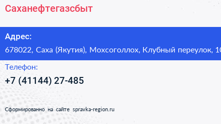 Саханефтегазсбыт по адресу 678022, Саха (Якутия), Мохсоголлох, Клубный переулок, 10 в дальнейшем Организация, размещена в следующих категориях: