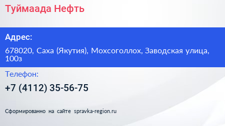 Туймаада-Нефть по адресу 678020, Саха (Якутия), Мохсоголлох, Заводская улица, 100з в дальнейшем Организация, размещена в следующих категориях: