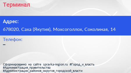 Терминал по адресу 678020, Саха (Якутия), Мохсоголлох, Соколиная, 14 в дальнейшем Организация, размещена в следующих категориях: