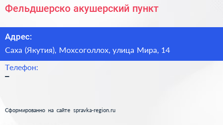 Фельдшерско-акушерский пункт по адресу Саха (Якутия), Мохсоголлох, улица Мира, 14 в дальнейшем Организация, размещена в следующих категориях: