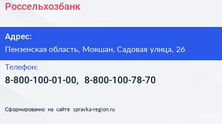 Россельхозбанк по адресу Пензенская область, Мокшан, Садовая улица, 26 в дальнейшем Организация, размещена в следующих категориях:
