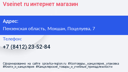 Vseinet.ru, интернет-магазин по адресу Пензенская область, Мокшан, Поцелуева, 7 в дальнейшем Организация, размещена в следующих категориях: