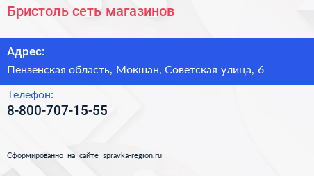 Бристоль, сеть магазинов по адресу Пензенская область, Мокшан, Советская улица, 6 в дальнейшем Организация, размещена в следующих категориях: