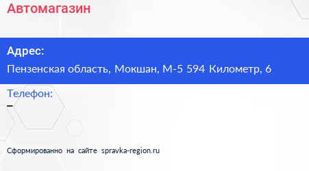 Автомагазин по адресу Пензенская область, Мокшан, М-5 594 Километр, 6 в дальнейшем Организация, размещена в следующих категориях: