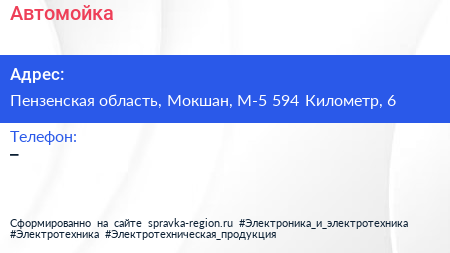 Автомойка по адресу Пензенская область, Мокшан, М-5 594 Километр, 6 в дальнейшем Организация, размещена в следующих категориях: