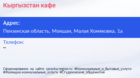 Кыргызстан, кафе по адресу Пензенская область, Мокшан, Малая Хомяковка, 1а в дальнейшем Организация, размещена в следующих категориях: