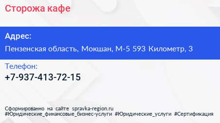 Сторожа, кафе по адресу Пензенская область, Мокшан, М-5 593 Километр, 3 в дальнейшем Организация, размещена в следующих категориях: