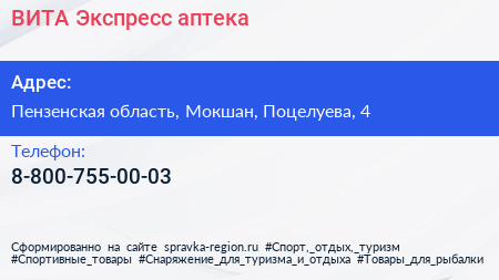 ВИТА Экспресс, аптека по адресу Пензенская область, Мокшан, Поцелуева, 4 в дальнейшем Организация, размещена в следующих категориях: