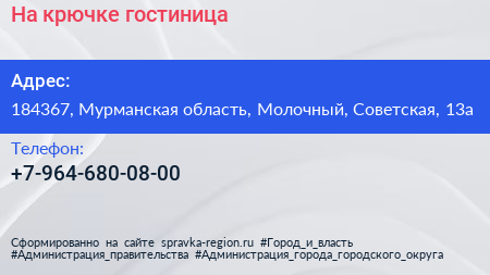 На крючке, гостиница по адресу 184367, Мурманская область, Молочный, Советская, 13а в дальнейшем Организация, размещена в следующих категориях: