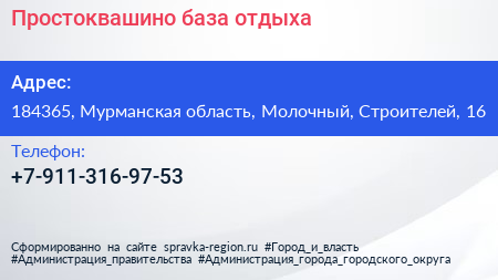 Простоквашино, база отдыха по адресу 184365, Мурманская область, Молочный, Строителей, 16 в дальнейшем Организация, размещена в следующих категориях: