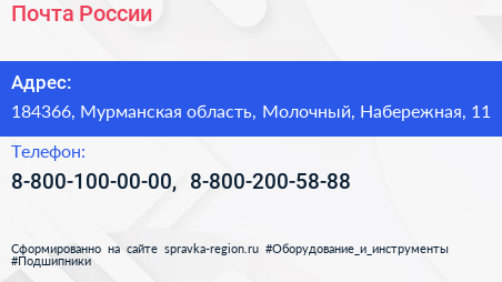 Почта России по адресу 184366, Мурманская область, Молочный, Набережная, 11 в дальнейшем Организация, размещена в следующих категориях: