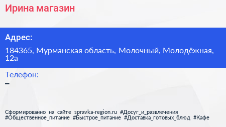 Ирина, магазин по адресу 184365, Мурманская область, Молочный, Молодёжная, 12а в дальнейшем Организация, размещена в следующих категориях: