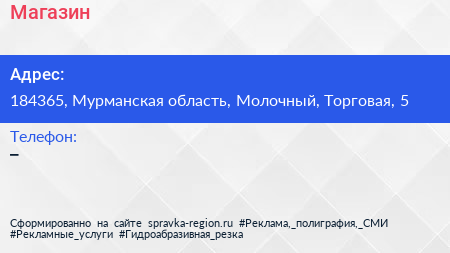 Магазин по адресу 184365, Мурманская область, Молочный, Торговая, 5 в дальнейшем Организация, размещена в следующих категориях: