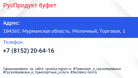 РусПродукт, буфет по адресу 184365, Мурманская область, Молочный, Торговая, 1 в дальнейшем Организация, размещена в следующих категориях: