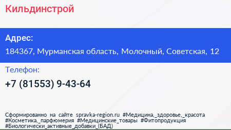 Кильдинстрой по адресу 184367, Мурманская область, Молочный, Советская, 12 в дальнейшем Организация, размещена в следующих категориях:
